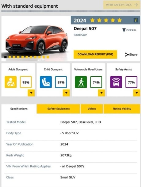 Deepal S07 ได้คะแนนสูงสุดในหมวด ความปลอดภัยผู้ใหญ่ ซึ่งเป็นคะแนนที่ดีที่สุดในปี 2024 ของ Euro NCAP